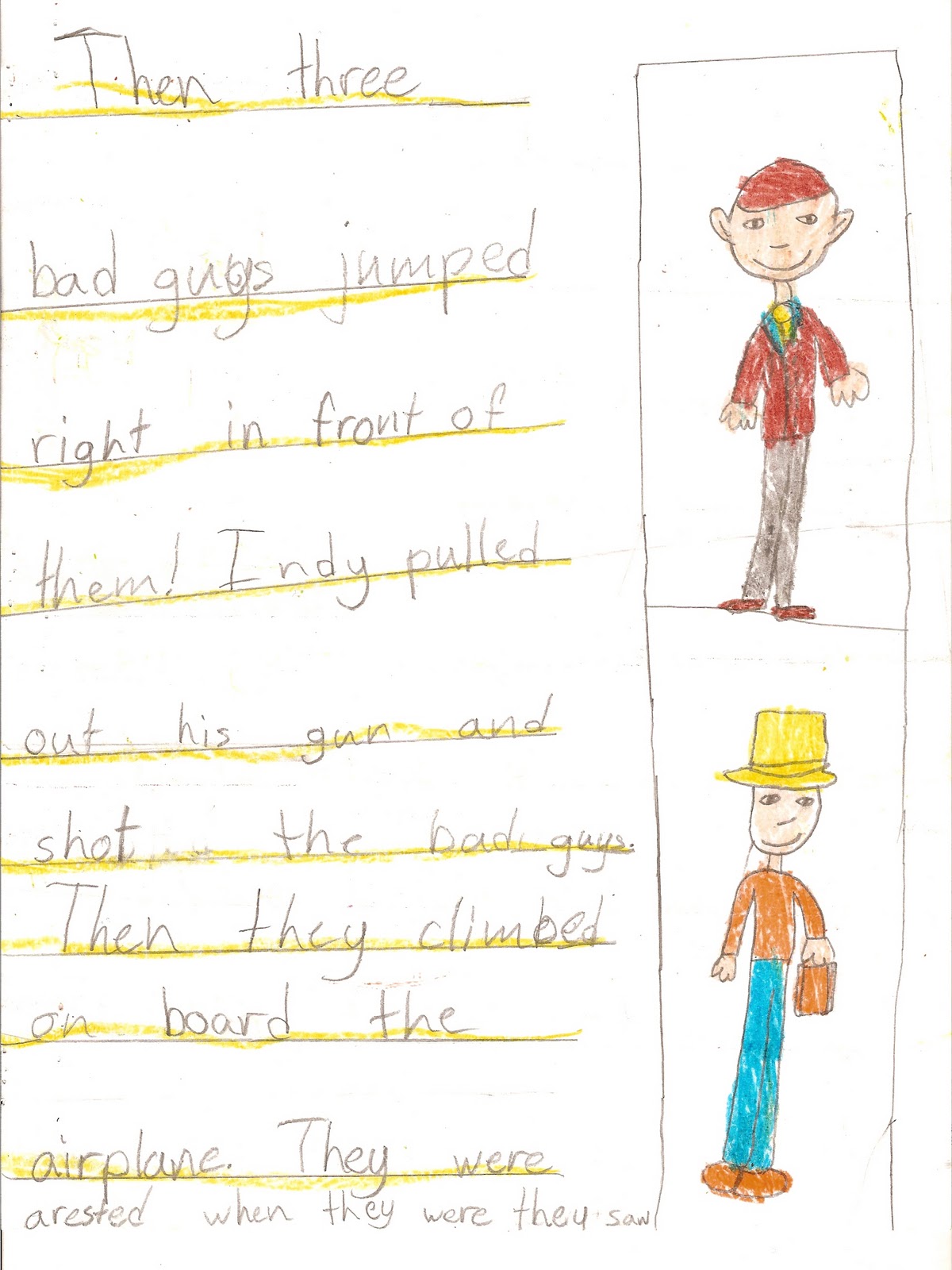 "Then three bad guys jumped right in front of them. Indy pulled out his gun and shot the bad guys. Then they climbed on board the airplane. They were arrested when they were they saw . . . "